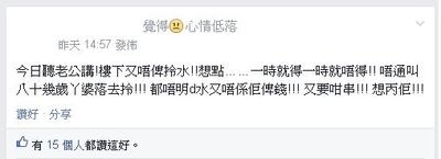 - ↑ facebook: 今日聽老公講!樓下又唔俾拎水!!想點……一時就得一時就唔得!! 唔通叫八十幾歲丫婆落去拎!!! 都唔明d水又唔係佢俾錢!!! 又要咁串!!! 想丙佢!!!,2015年7月14日