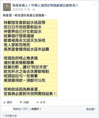 10月18日,facebook群組「我係香港人!50萬人強烈反對批綜援比新移民!」發表一張製圖,道盡對香港官員處理鉛水問題發表言論的忿怒,製圖迅即在互聯網瘋傳。