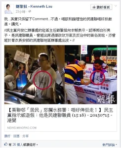 - ↑ 劉肇恒 - Kenneth Lau fb專頁:我...其實只係留下Comment...不過,唔該和諧理性的民建聯唔好扮激進。講完。,2015年7月15日