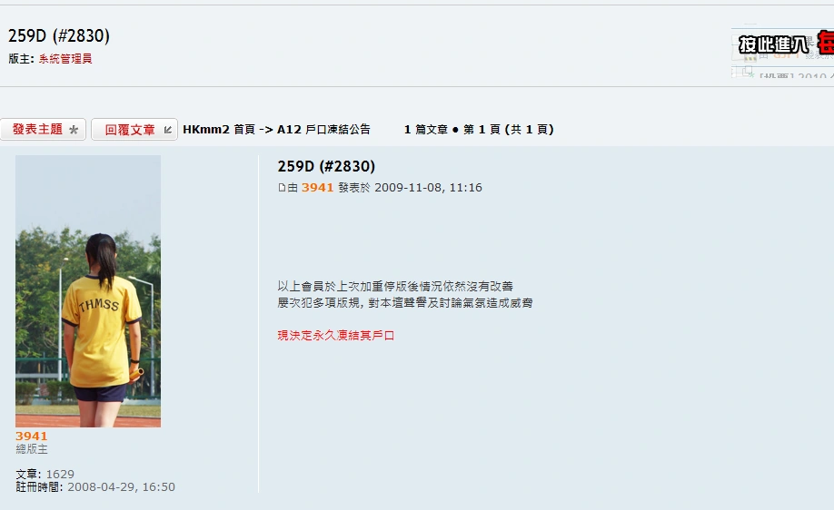 被HKmm2永停後, 259D突然進攻LWSDC,於 G7區 發表"[HKTBF] 2009 - 11 - 19 緊急更新"[13],以紅色大字將私人恩怨帶到壇中,被薯頭處分乙個警告。