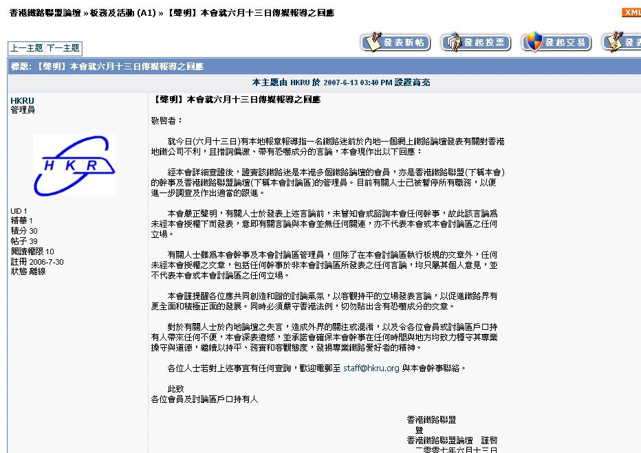 - ↑ 鐵路狂迷網上揚言炸地鐵,取自《東方日報》,2007-6-13。