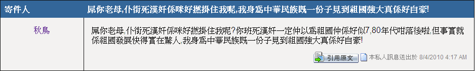 | 「 | ×你老×,仆×死漢奸係咪好×掛住我呢?你班死漢奸一定仲以為祖國仲係好似7,80年代咁落後啦,但事實就係祖國發展快得實在驚人,我身為中華民族既一份子見到祖國強大真係好自豪! | 」 |