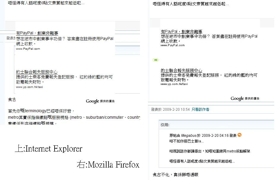 - ↑ 山頂柯士甸山路是否沒有街燈?(指出廣告言論者為Lrt505,「GOOGLE 已經為你提供街象服務﹐慢慢遊覽一下」廣告用語的發表者為kei_hk)