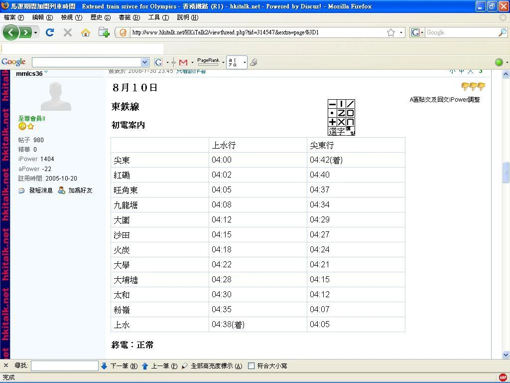 2008年7月31日早上,mmlcs36在HKiTalk香港鐵路分版,預先貼出了在北京奧運馬術賽事(簡稱「馬運」)期間,港鐵各路線列車班次時間表。[3]但他在發文初期,卻以日本式的列車時刻表顯示,並用上了一些日文漢字。