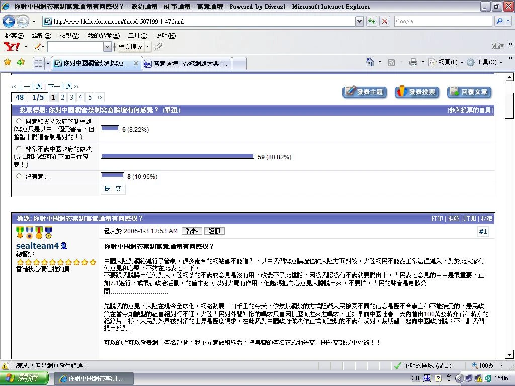 前任寫意論壇的總督察兼「政治論壇」及「影視討論」版主,曾因大陸網絡特警「封殺」寫意論壇而於2006年1月3日開帖「你對中國網管禁制寫意論壇有何感覺?」為此事作投票和討論,結果有八成「寫意」網友都對中國政府此舉表視強烈不滿。雖然後來有親中的大陸網友重新出現並聲稱大陸網絡特警已將「寫意」解封,並借此宣揚黨的「開明」,但是現在來「寫意」的大陸網友數量已經大不如前,而且當中亦以親共份子和愛國憤怒青年佔大多數。