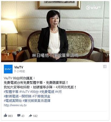 當時在個多月後才開台的ViuTV,在2016年2月23日於facebook發帖「抽水」,留言:「ViuTV 99台同你講真:免費電視台有免費繁體字幕,免費聽廣東話!」